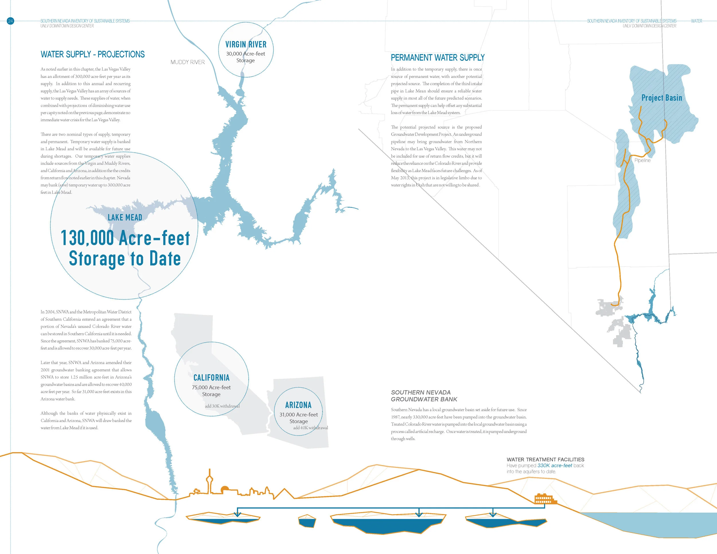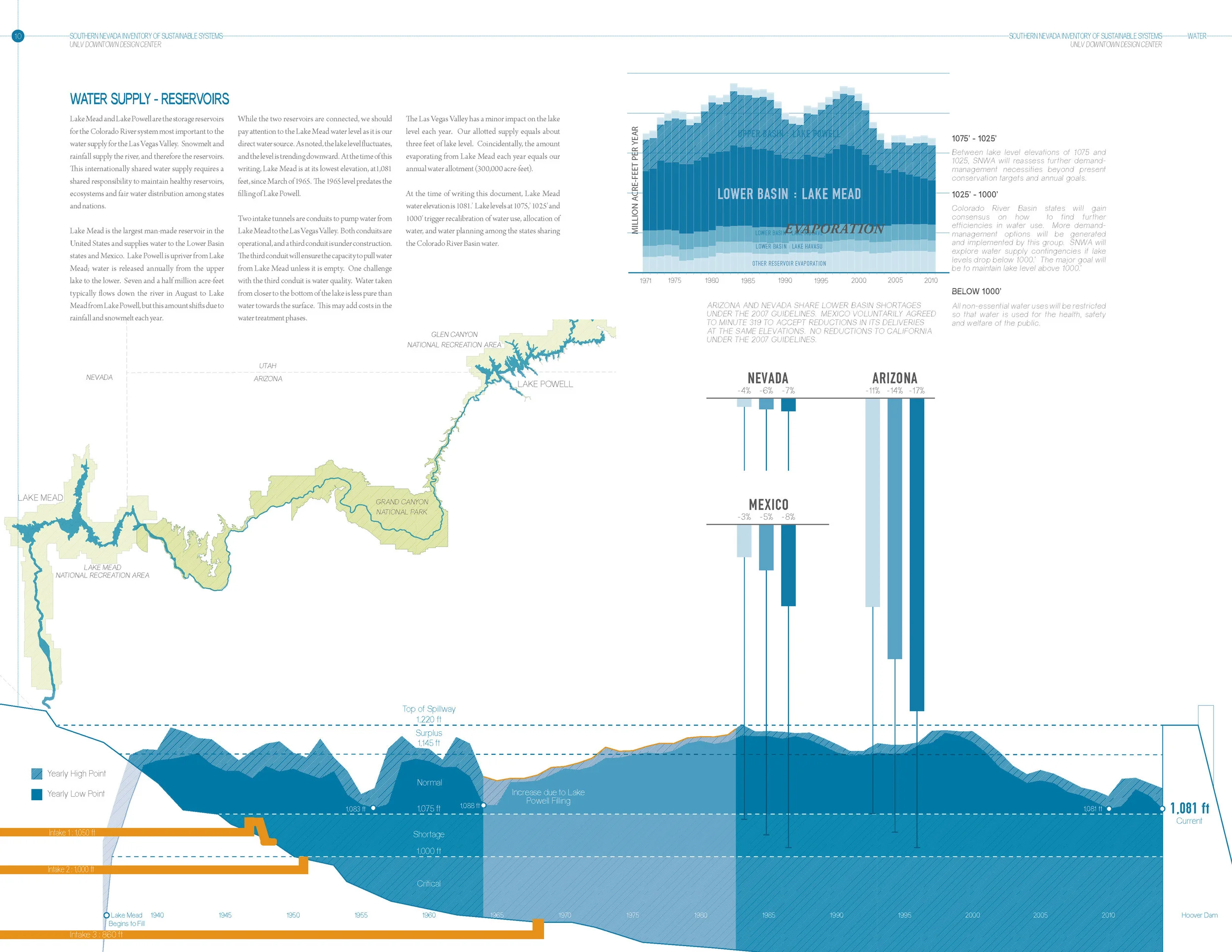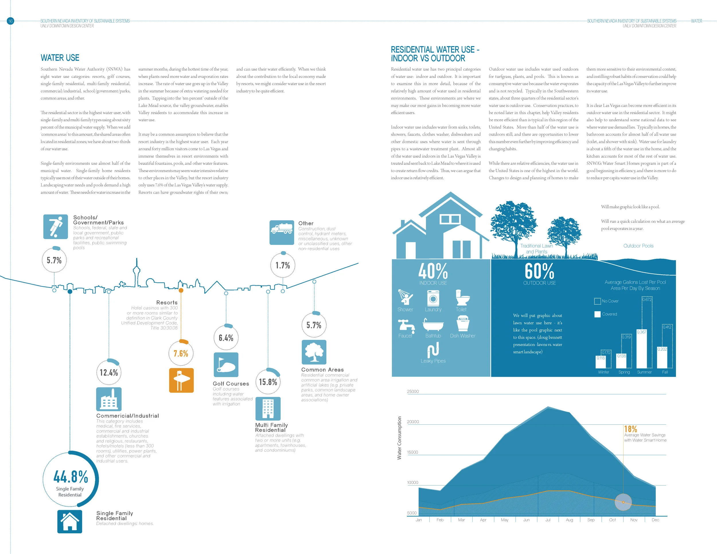 This is the water chapter from the Southern Nevada Inventory of Sustainable Systems, also known as the Las Vegas Sustainability Atlas. Las Vegas is incorrectly tied to the water loss in Lake Mead, and the resort industry is improperly noted as a prime culprit. The resort industry only uses about seven percent of the annual water use. The resort industry sees about 40 million visitors per year, the metropolitan population is two million. The metropolitan area is very efficient in its water use, returning almost two-thirds of its used water back into the lake each year. The only way Las Vegas will go completely dry is if the Colorado River runs dry.