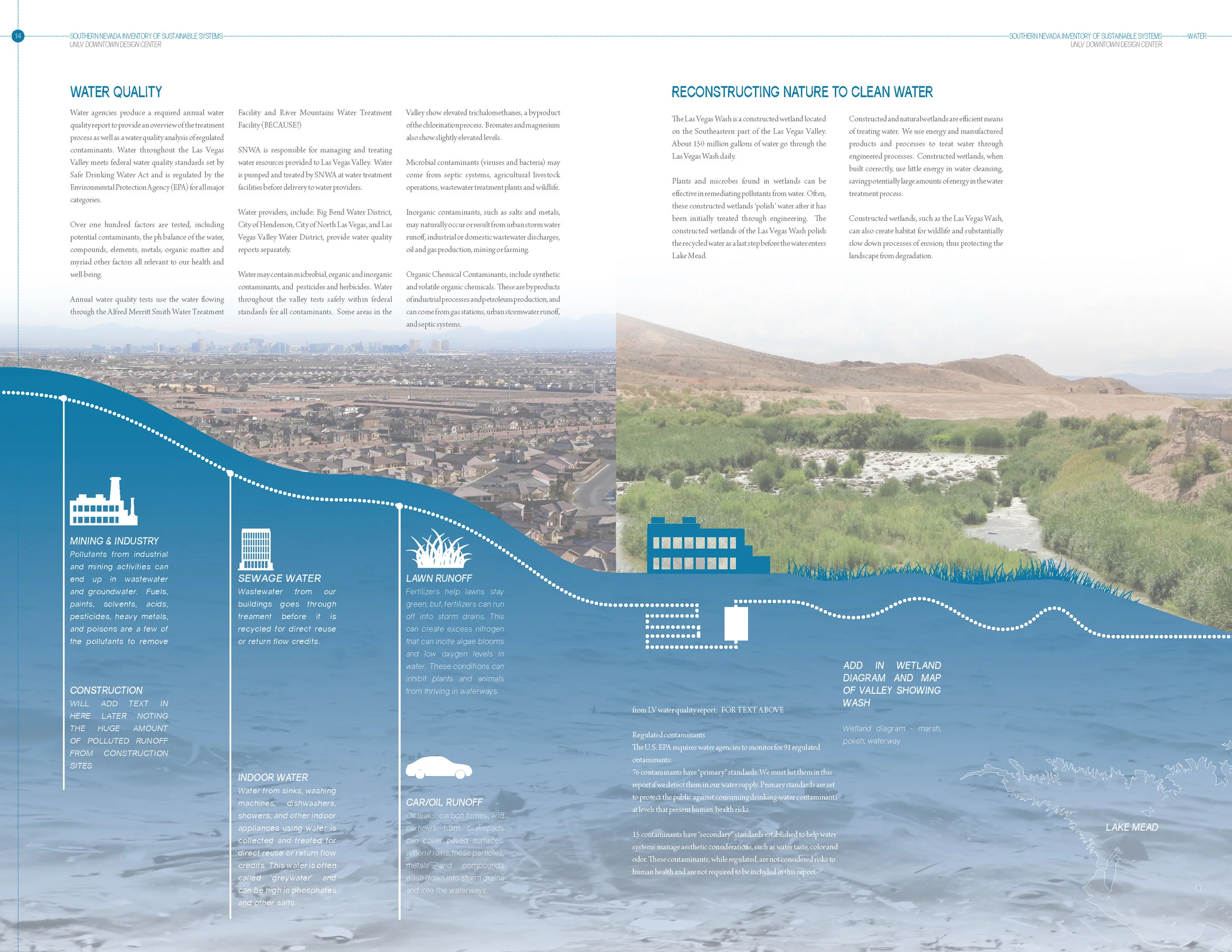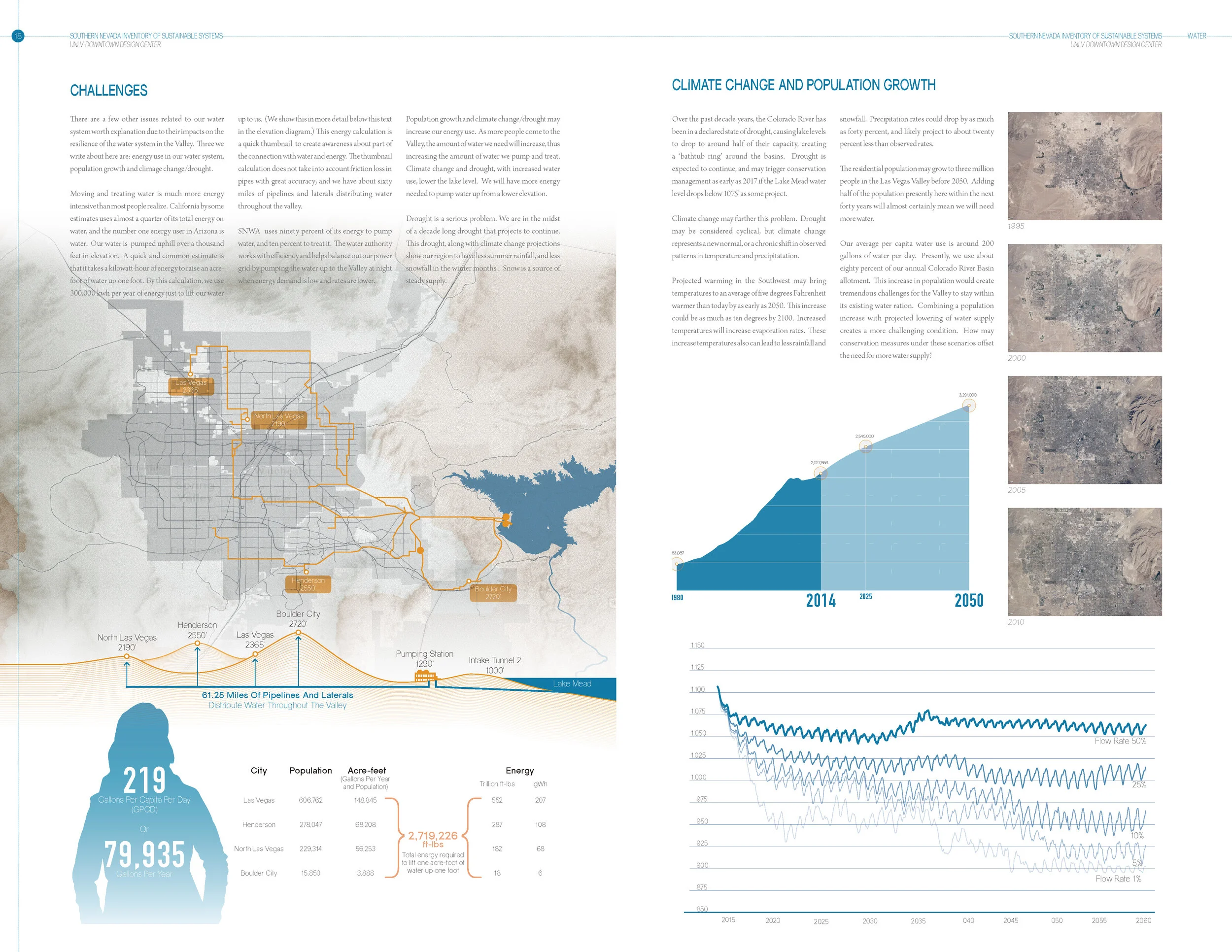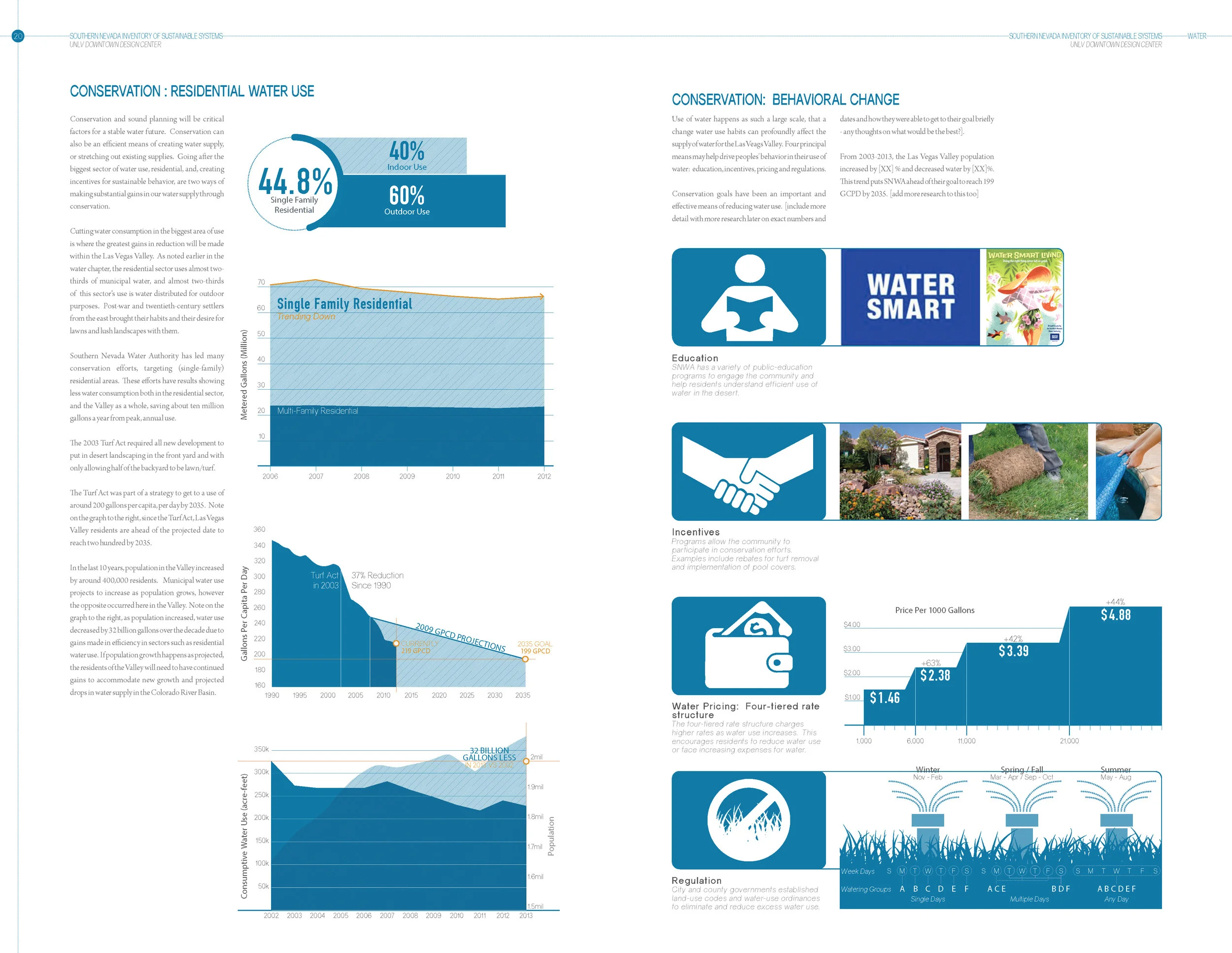 This is the water chapter from the Southern Nevada Inventory of Sustainable Systems, also known as the Las Vegas Sustainability Atlas. Las Vegas is incorrectly tied to the water loss in Lake Mead, and the resort industry is improperly noted as a prime culprit. The resort industry only uses about seven percent of the annual water use. The resort industry sees about 40 million visitors per year, the metropolitan population is two million. The metropolitan area is very efficient in its water use, returning almost two-thirds of its used water back into the lake each year. The only way Las Vegas will go completely dry is if the Colorado River runs dry.