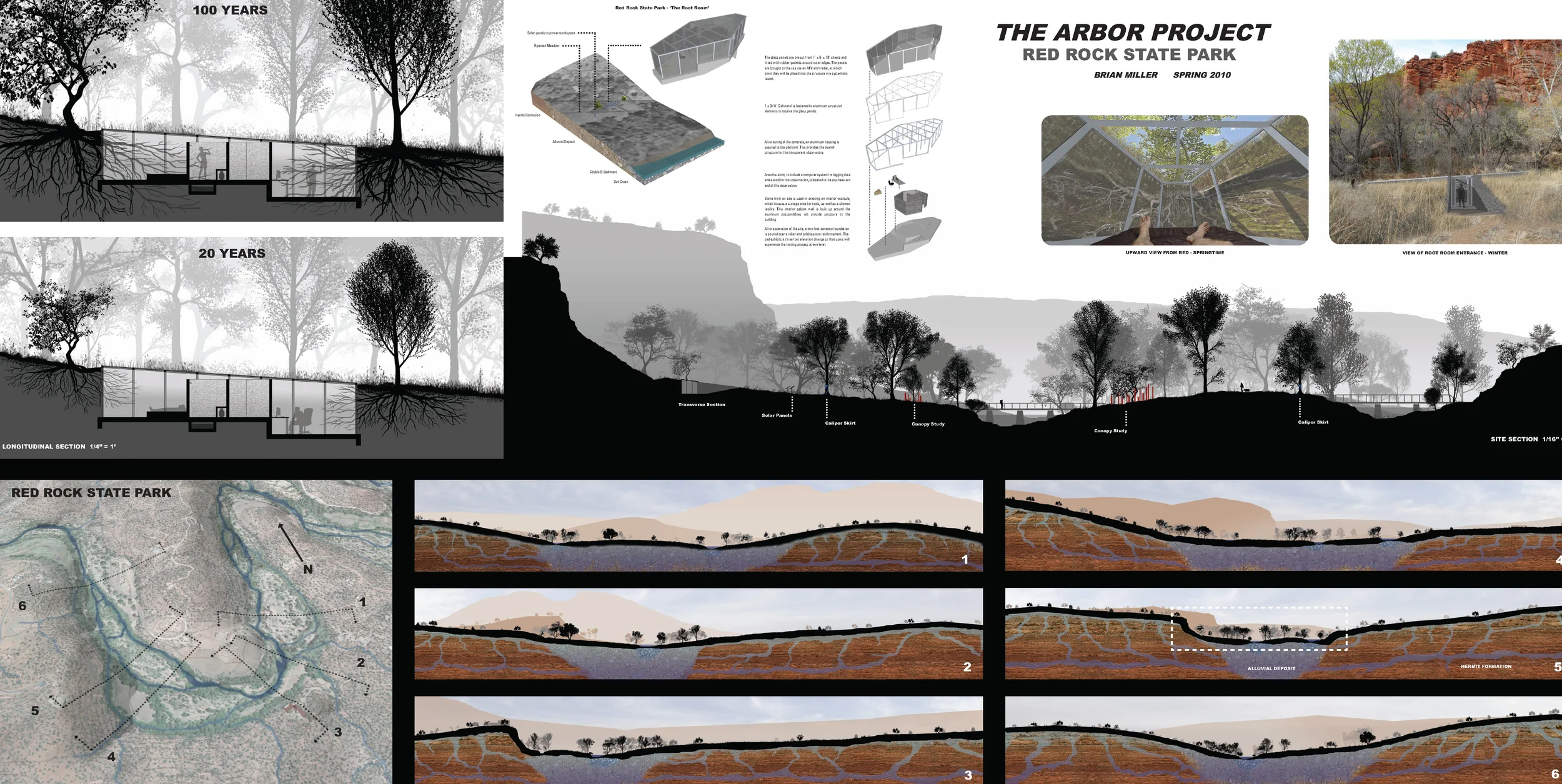 Our studio typically does three to four sites per semester to give students an exposure to an array of landscapes. A few hours away from Red Rocks State Park, another group looked at the Organ Pipe Cactus National Park. It has some of the darkest skies in the Southwest. Dan Valenza's design was a 'moon observatory.' He used trips and Google Earth to find a point to marry the moon cycles and the landscapes. The moon will rise and set at distinct points viewers can notice. He faced a severe challenge with his remote location. How does one sleep, eat and bathe/use the restroom without any infrastructure? Dan's solution involved placing a prefab building at the base of the mountain where the observatory was located. The station on top of the mountain was built from rock fragments up there. (image is a gallery, click images to put into lightbox.)